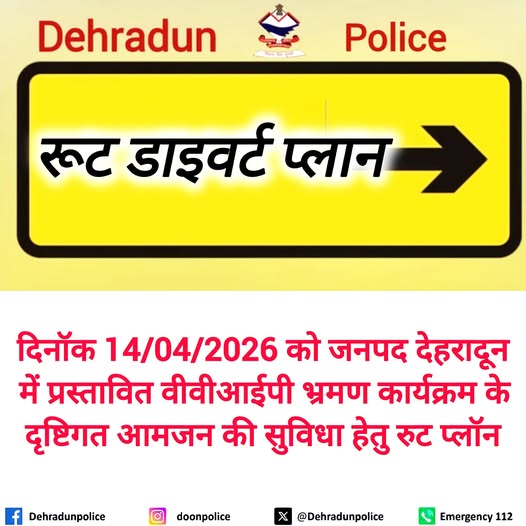 दिनॉक 14/04/2026 को जनपद देहरादून में प्रस्तावित वीवीआईपी भ्रमण कार्यक्रम के दृष्टिगत आमजन की सुविधा हेतु रुट प्लॉन इस प्रकार होगा