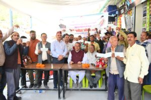 सहस्त्रधारा में आपदा प्रभावित दुकानदारों को सहायता राशि के चैक वितरित करते कैबिनेट मंत्री गणेश जोशी