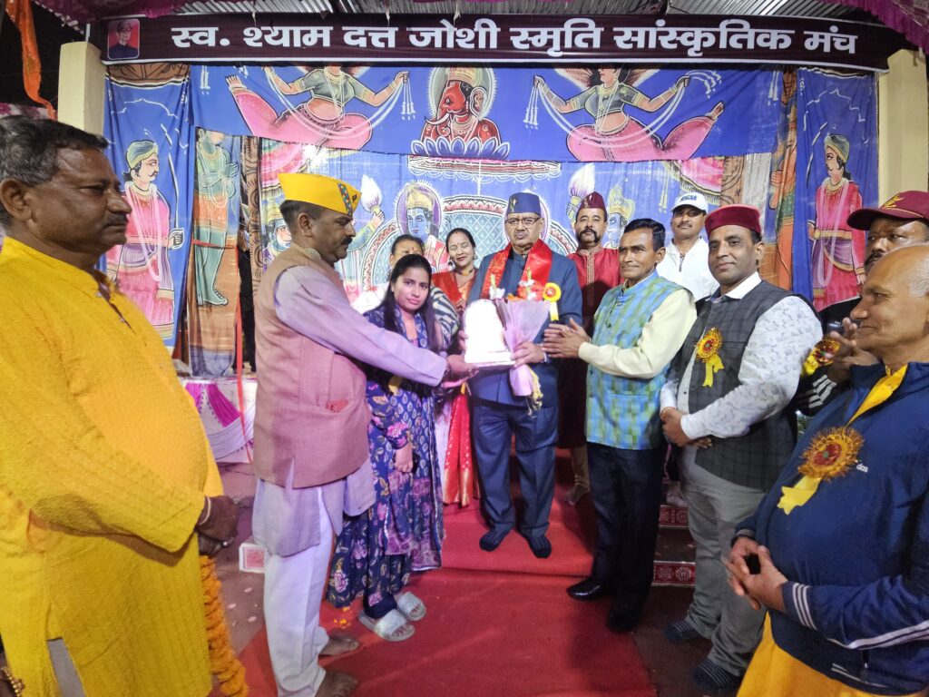 रामलीला का शुभारंभ एवं अपने स्वर्गीय पिता श्याम दत्त जोशी की पुण्य स्मृति में निर्मित ‘सांस्कृतिक मंच’ का लोकार्पण करते कैबिनेट मंत्री गणेश जोशी।