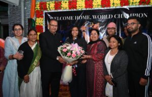 मसूरी में केंद्रीय रक्षा मंत्री राजनाथ सिंह का उत्तराखण्ड आगमन पर स्वागत करते सैनिक कल्याण मंत्री गणेश जोशी